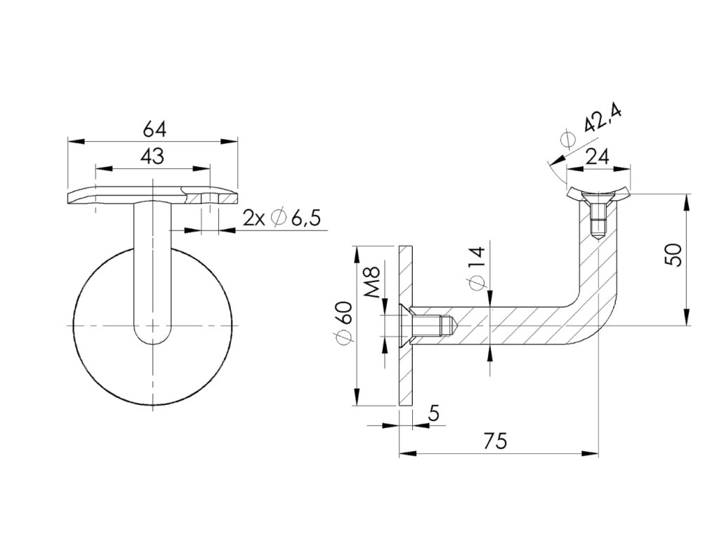 Nerezový držák madla (pr. 42.4 mm) pro montáž na zeď, AISI 304