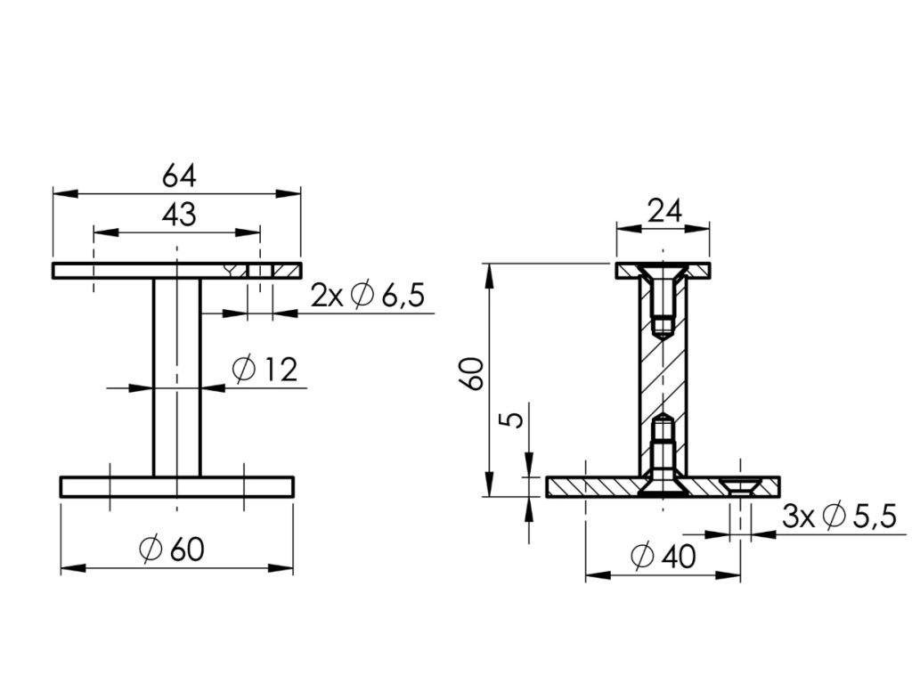 Držák horizontálního madla 40x40 mm, AISI 304 - brus
