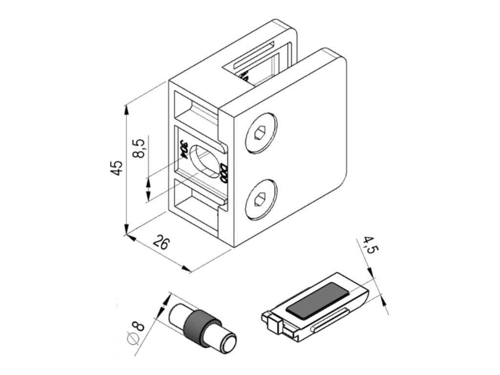 Držák je určen k upevnění a stabilizaci skleněné, plechové nebo tabulové výplně v zábradlí, balkonech či schodištích. Zajišťuje pevné a bezpečné uchycení výplně a stabilitu celé konstrukce.