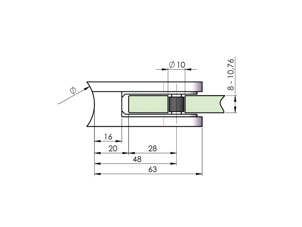 Držák je určen pro upevnění výplní ze skla nebo plechu o tloušťce 8 / 8,76 / 10 / 10,76 / 1,5 / 2 / 3 mm. Výplně jsou bezpečně drženy pomocí svěrného spoje (doporučeno pro vrchní kotvení) nebo svěrného spoje + kolíku (doporučeno pro boční kotvení), který zajišťuje pojištění proti vypadnutí skla.