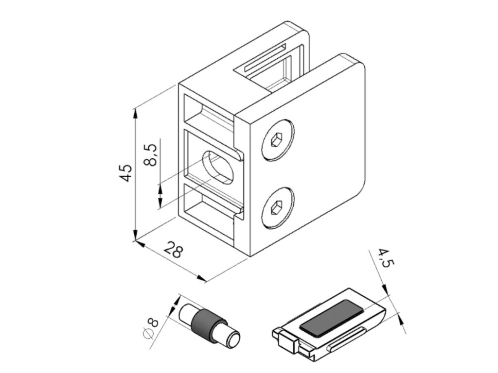 Držák je určen k upevnění a stabilizaci skleněné, plechové nebo tabulové výplně v zábradlí, balkonech či schodištích. Zajišťuje pevné a bezpečné uchycení výplně a stabilitu celé konstrukce.