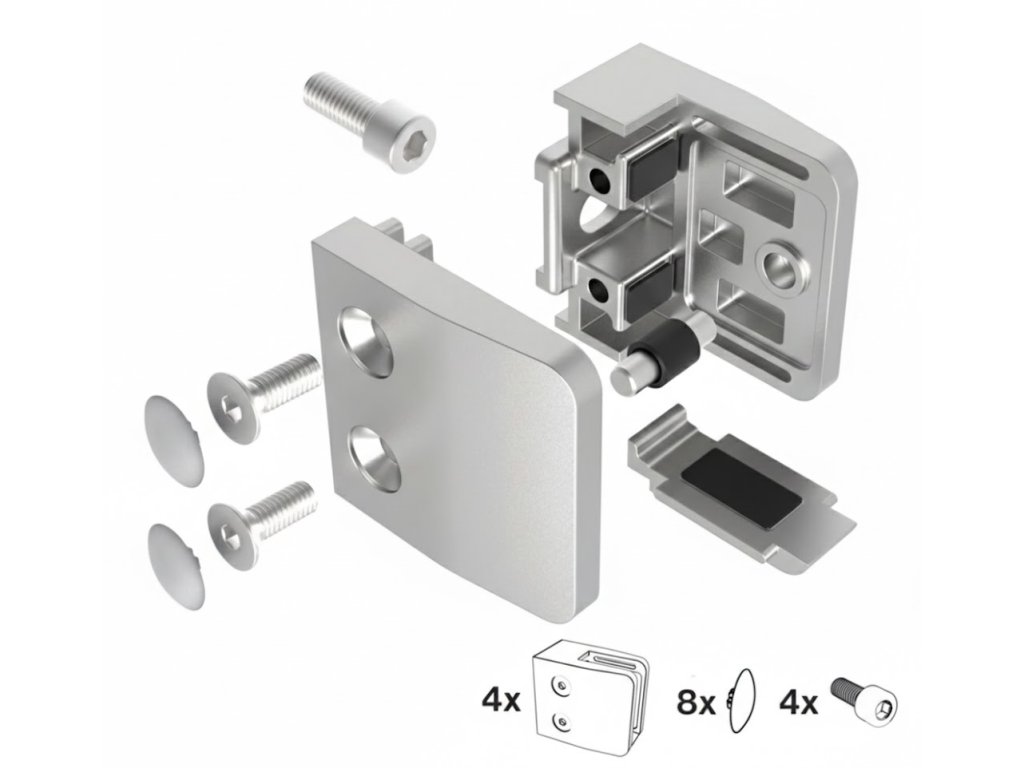SET4 obsahuje kompletní sadu 4 ks držáků skleněné výplně (v rozebraném stavu) s upevňovacím materiálem: