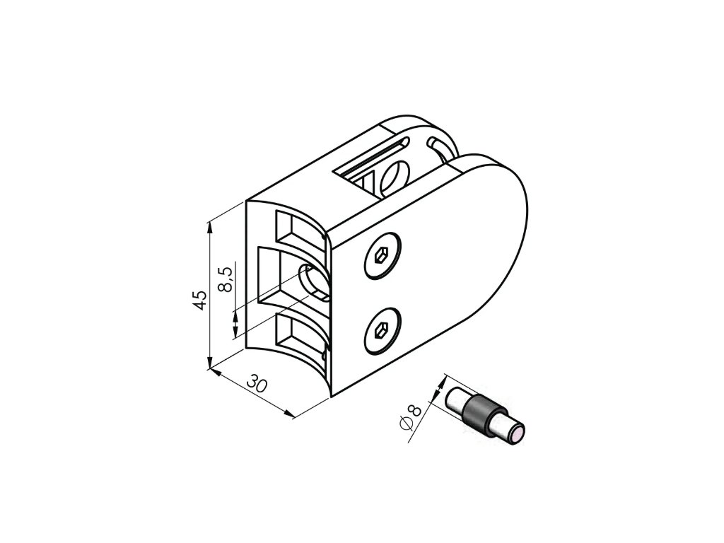 Držák skleněné, plechové nebo tabulové výplně. Držení výplně (pojištění proti vypadnutí) je zajištěno svěrným spojem (doporučené použití při vrchním kotvení) nebo svěrným spojem + kolíkem (doporučené použití pro boční kotvení). Držák neobsahuje těsnění ani krytky šroubů – nutné dokoupit 2 ks těsnění podle tloušťky skla.