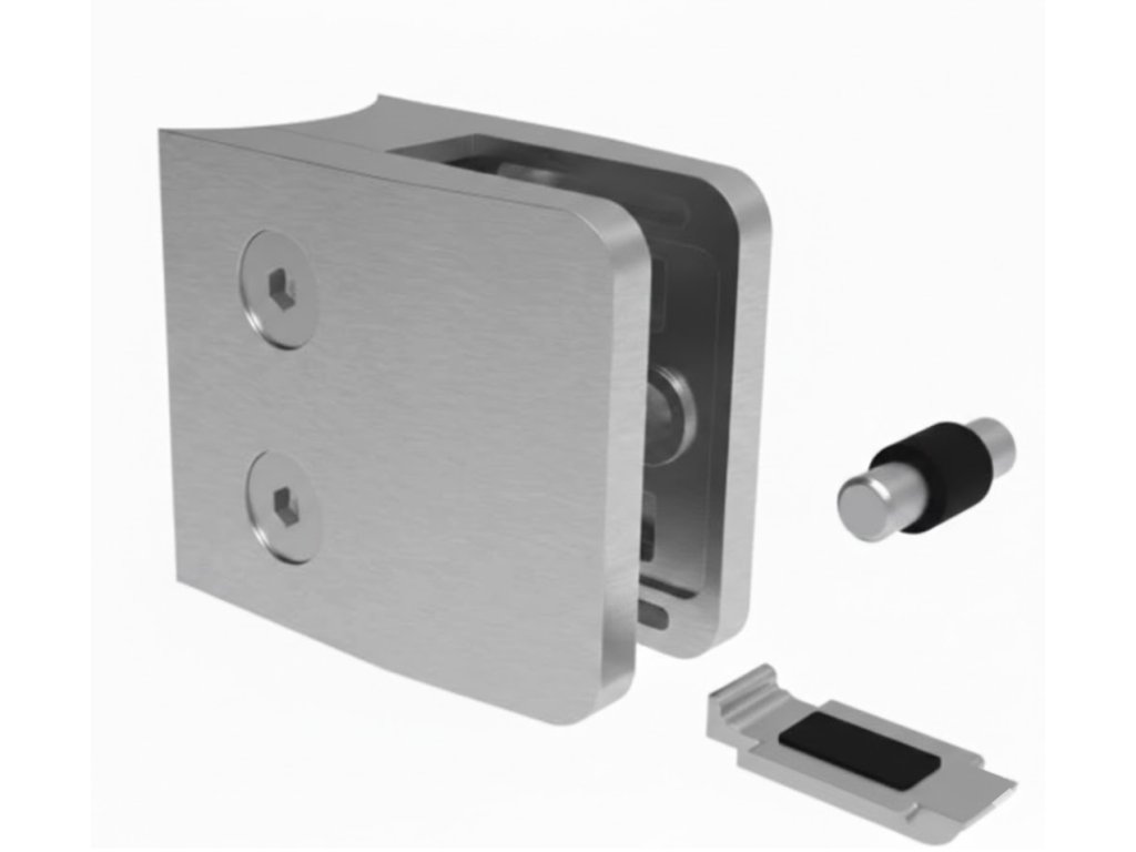 Držák skleněné, plechové nebo tabulové výplně. Držení výplně (pojištění proti vypadnutí) zajišťuje svěrným spojem, případně kombinací s kolíkem nebo bezpečnostním plátkem při bočním kotvení. Držák neobsahuje těsnění ani krytky šroubů – nutné dokoupit dle tloušťky skla.