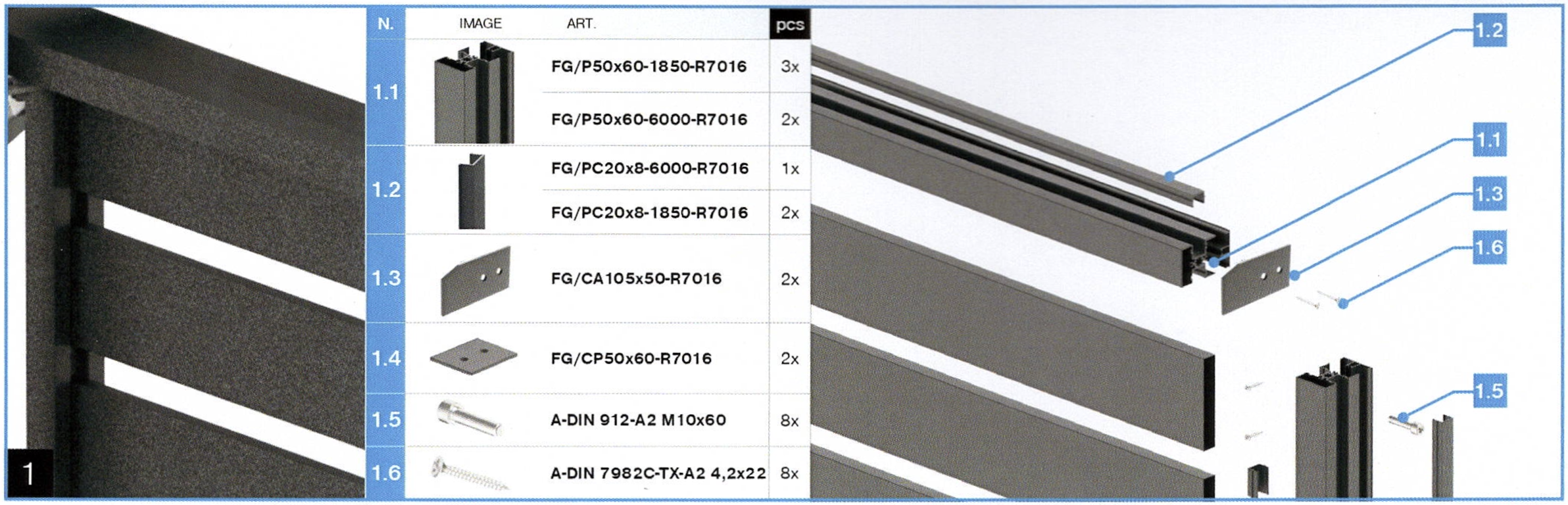 Sada hliníkového sloupku 50x60 a krytky - 1850mm R7016 |