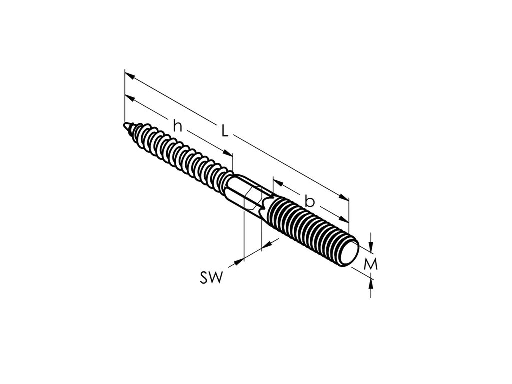 Kombinovaný šroub, známý také jako oboustranný šroub, je vyroben z nerezové oceli AISI 304 v surovém stavu. Na jedné straně je opatřen závitem do dřeva, na druhé metrickým závitem, což umožňuje spojování dvou různých materiálů. Je ideální pro kotvení kovových prvků do dřeva, například při montáži nerezového zábradlí, nosných trámů nebo venkovních konstrukcí.