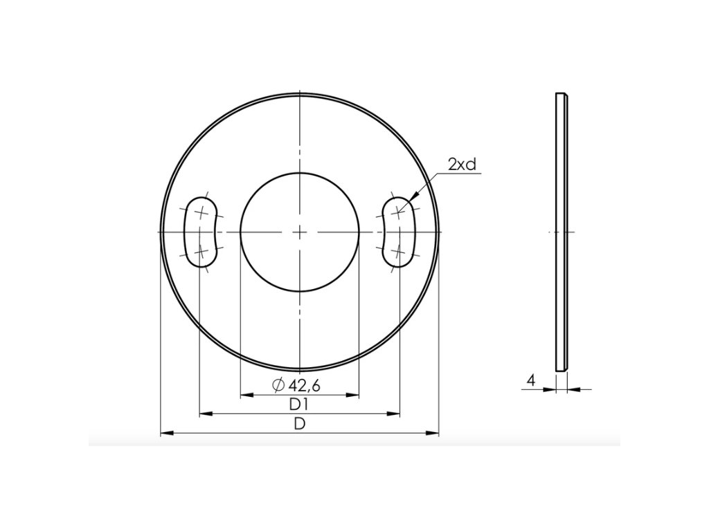 Nerezová kotvicí rozeta pro horní kotvení sloupků, vyrobená z nerezové oceli AISI 304 v surovém stavu. Rozeta je určena pro svařované spojení sloupku s podkladem a je vybavena dvěma oválnými montážními otvory, které umožňují jemné doladění polohy při montáži. Vhodná pro sloupky Ø 42,4 mm, ideální jako funkční a prostorově úsporný základ zábradlové konstrukce.