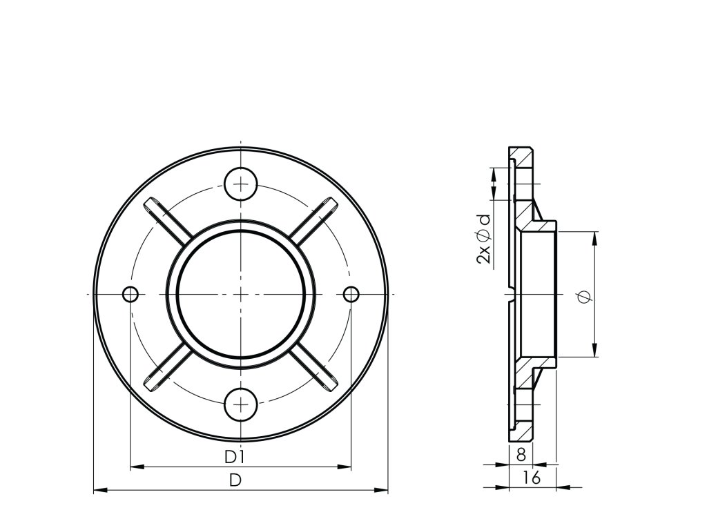 Montážní patka O100 x 8,0 mm, pro sloupek O42,4 mm, surová, AISI 304