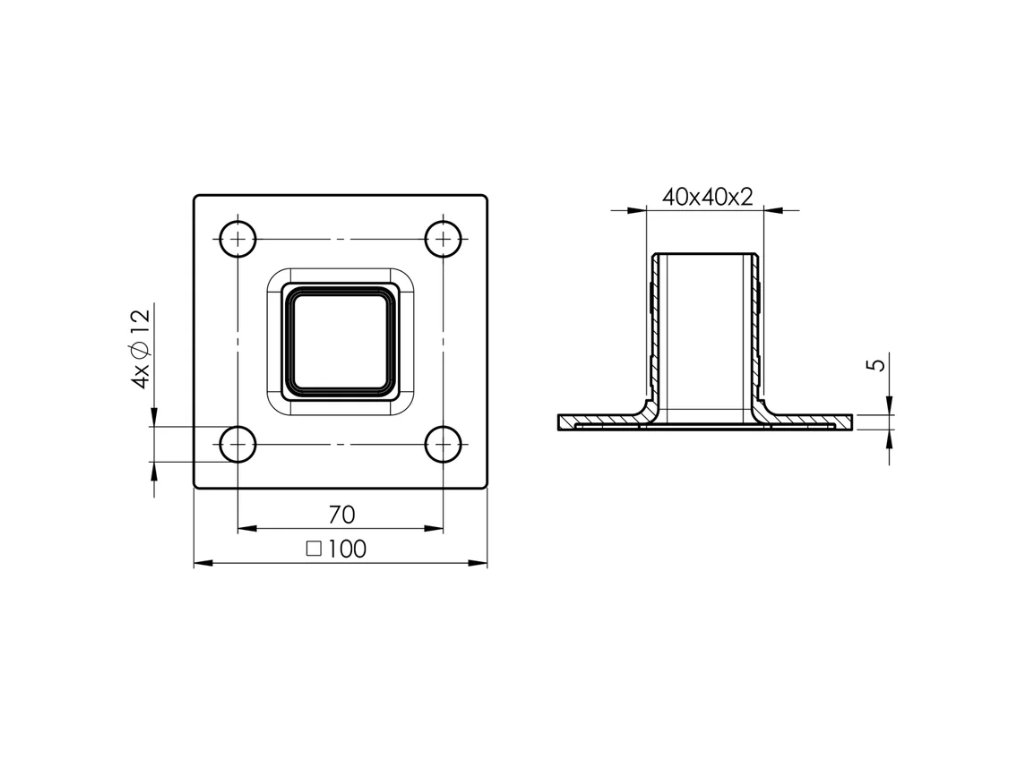 Montážní patka 100 x 10O mm pro profil 40 x 40 x 2 mm, AISI 304 - brus