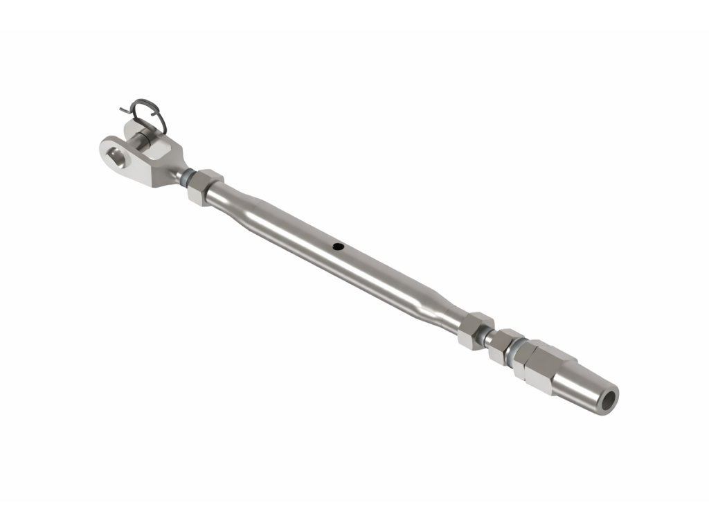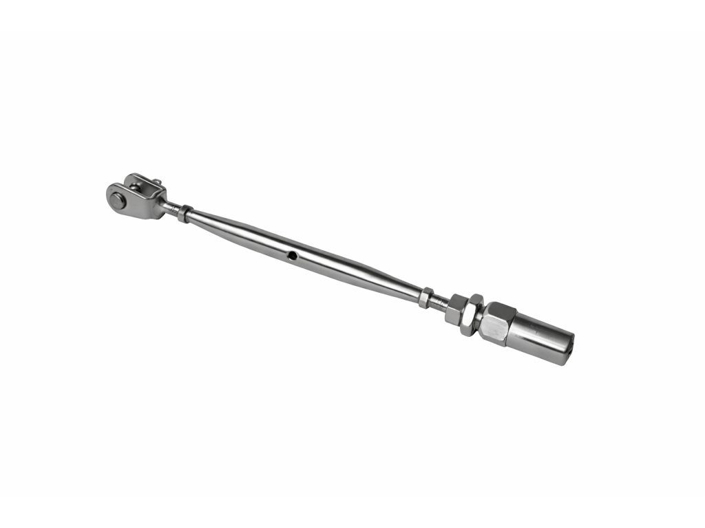 Nerezová úchytka lanka sloužící jako napínák pro přesné a bezpečné napnutí nerezového lanka v zábradlových systémech. Vhodná pro exteriérové i interiérové použití, zajišťuje stabilitu, dlouhou životnost a čistý technický vzhled.