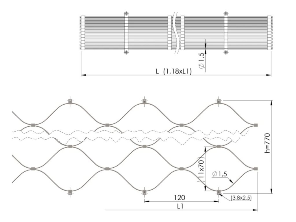 Lanková výplň (sít) se prodává na kusy. Prodává se v funkčním rozměru "L1", ne ve staženém stavu "L" Propojení lanek při L1=10m je UZAVŘENOU SPOJKOU