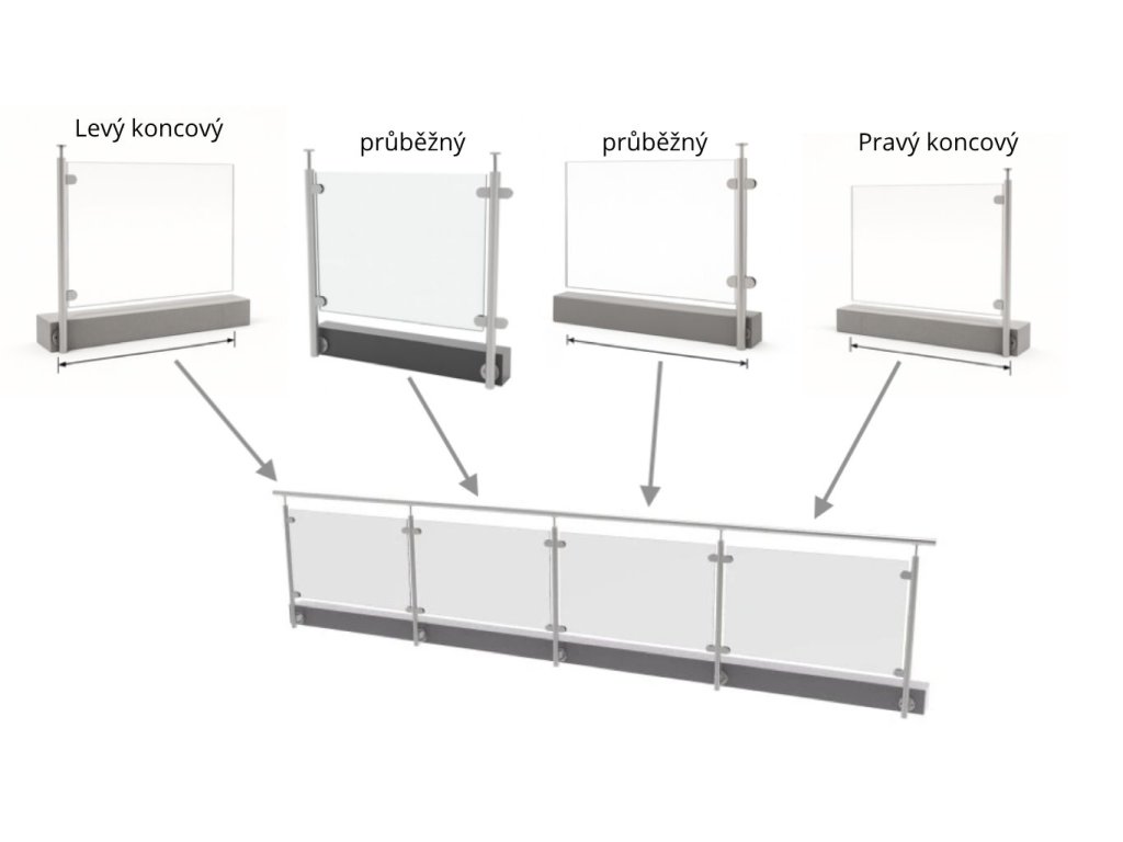 Nerezové zábradlí se skleněnou výplní, boční kotvení (VxŠ)- 1000x(562-1062)mm (LEVÝ KONCOVÝ)