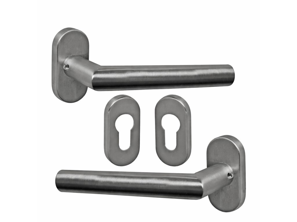 Klika se štítkem z nerezi AISI 304 v povrchové úpravě brus K320. Určena pro cylindrickou vložku, dodávána jako 1 pár (levá + pravá). Obsahuje pružinový vratný mechanismus s možností otočení pro změnu směru otevírání.
