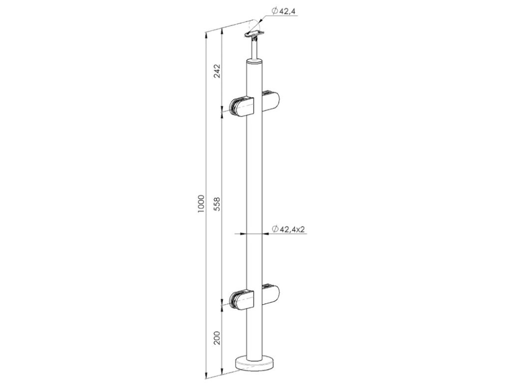 Nerezový sloupek pro rovné zábradlí určený pro skleněnou výplň tl. 8,76 mm a kruhové madlo Ø42 mm.
