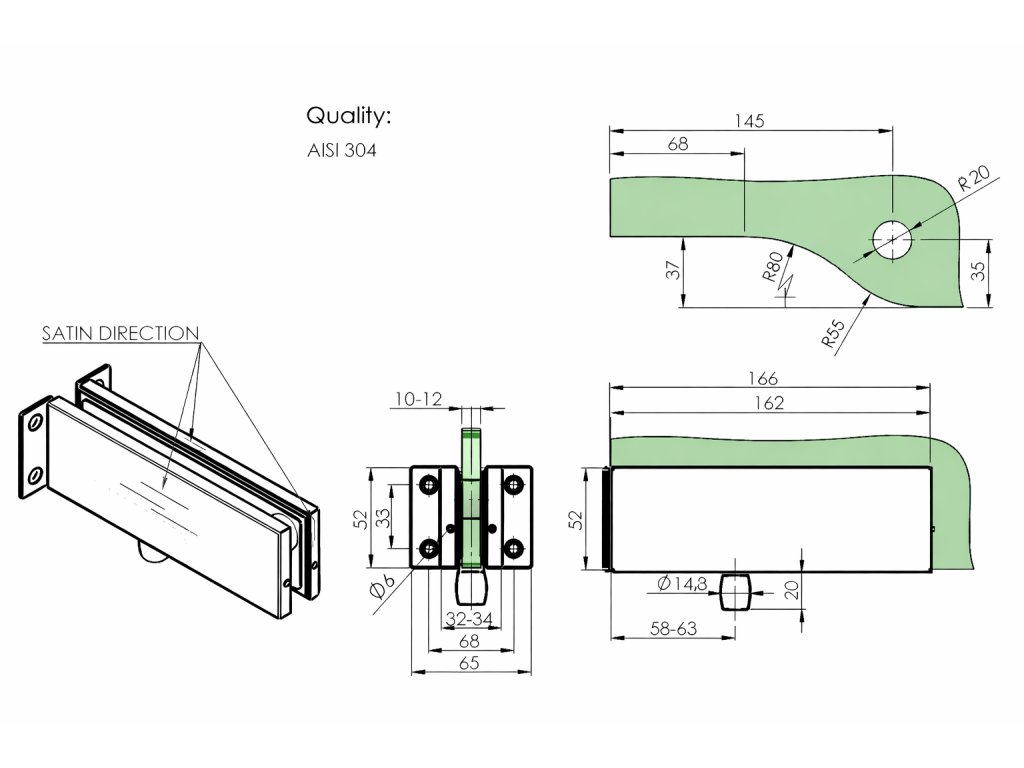 Držák skla s trnem pro závěs určený pro pevné zasklení v kombinaci se skleněnými dveřmi. Vyroben z nerezové oceli AISI 304 s povrchovou úpravou brus (satin).