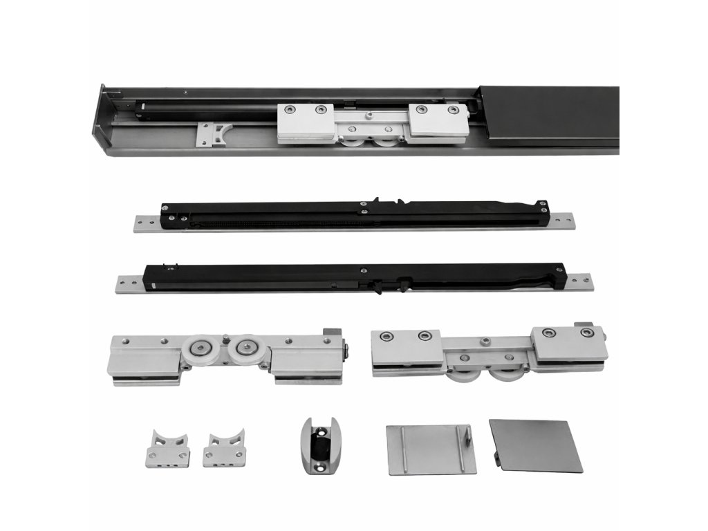 Systém zajišťuje plynulý a tichý chod dveří s bezpečným dovřením díky dvěma integrovaným brzdám. Není nutné vrtání otvorů do skla. Práškovaná povrchová úprava v černé barvě dodává moderní vzhled a vysokou odolnost.