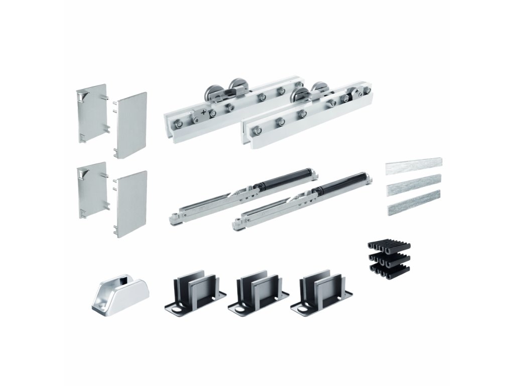 Součástí balení je vodicí a krycí profil, 2× vozík, 2× měkký doraz, koncové záslepky a spodní vodítko.