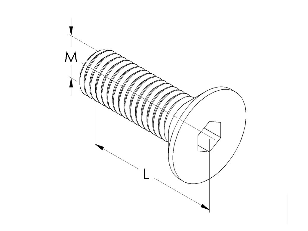 Šroub se zápustnou hlavou podle standardu DIN 7991, vyrobený z nerezové oceli AISI 316 v surovém stavu. Má plochý vrch s kónickou dosedací plochou a zapuštěný šestihranný otvor, což umožňuje hladké a rovné usazení. Vhodný pro montáže nerezových zábradlí, strojů, zařízení nebo automobilových komponent a širokou škálu průmyslových aplikací.