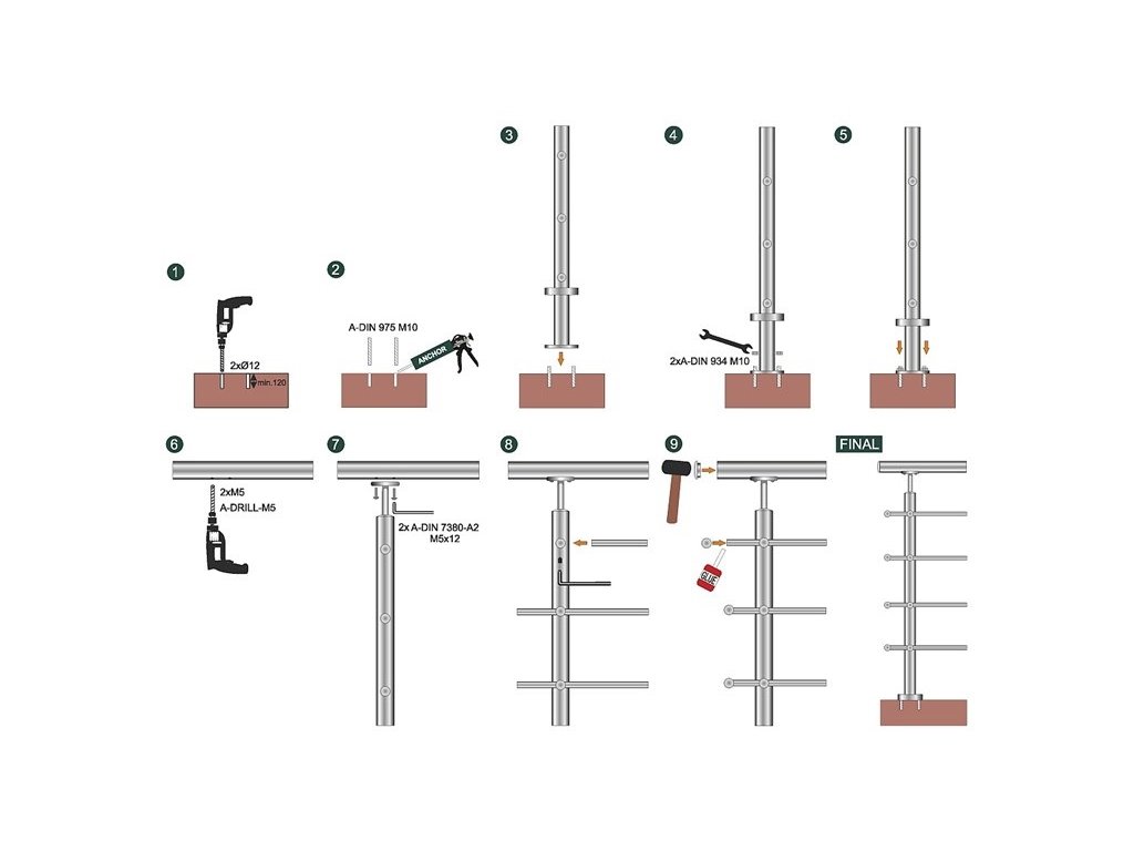 Kompletní set obsahuje všechny komponenty pro snadné sestavení zábradlí vlastními silami.