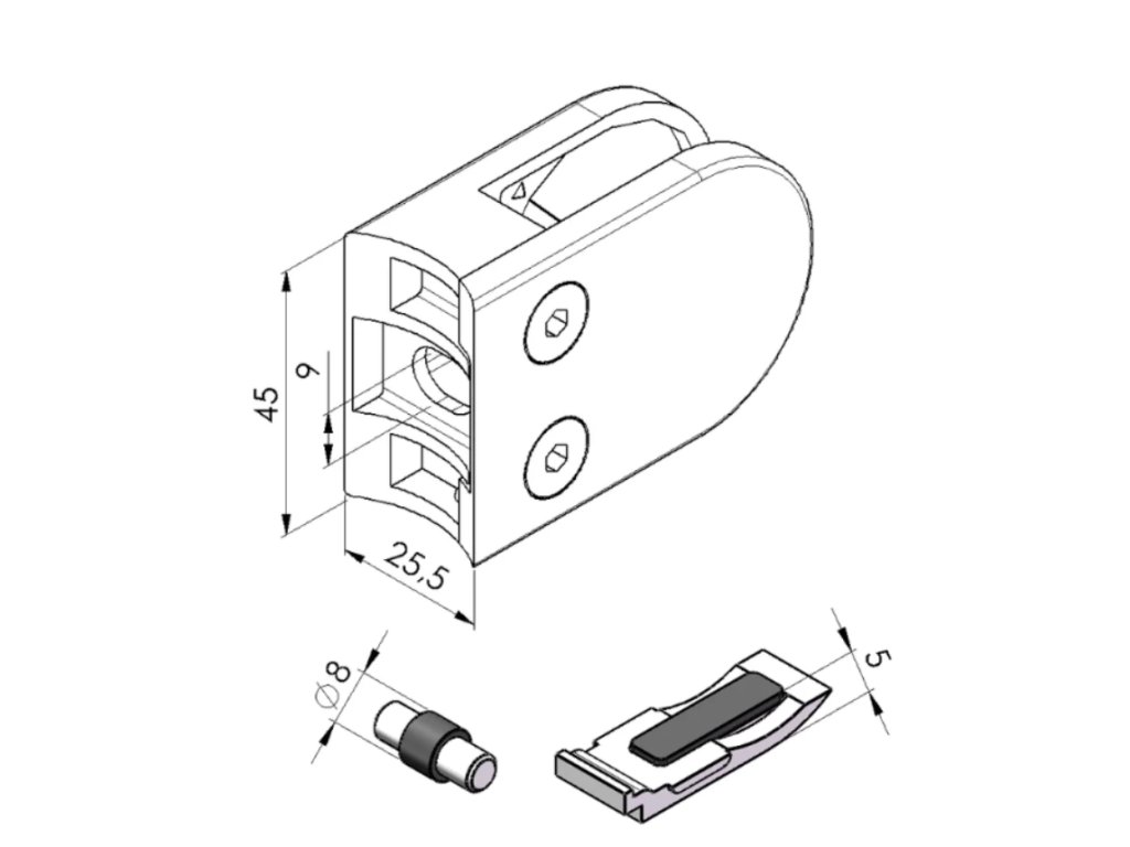Kvalitní nerezový držák pro skleněné, plechové nebo tabulové výplně zábradlí, balkónů a schodišť. Vyroben z nerezi AISI 304 s broušeným povrchem pro moderní vzhled a dlouhou životnost. Výplň je bezpečně jištěna svěrným spojem, případně kombinací svěrného spoje s kolíkem nebo bezpečnostní plotýnkou při bočním kotvení.