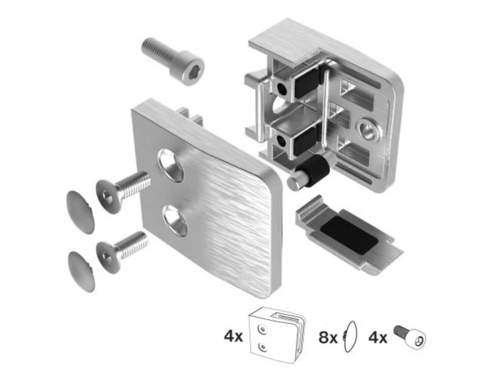 Držák skla 52x52mm pro plochý podklad, model 26 – SET 4 ks, nerez AISI 304, broušený