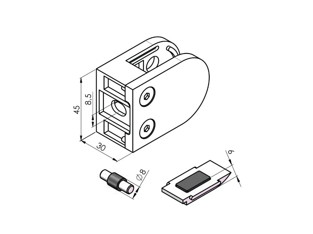 Nerezový držák pro skleněné, plechové nebo tabulové výplně zábradlí, balkónů a schodišť. Vyroben z kvalitní nerezi AISI 304 s broušeným povrchem pro moderní vzhled a dlouhou životnost. Výplň je bezpečně zajištěna svěrným spojem, případně kombinací svěrného spoje s kolíkem nebo bezpečnostní plotýnkou při bočním kotvení.